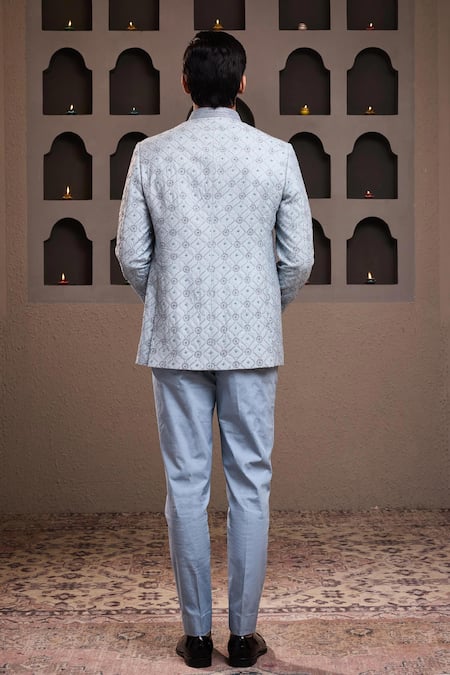 Sky blue Jodhpuri coat featuring tonal resham embroidery with bead, cutdana, and crystal embellishments. Paired with a matching pant for a complete look.