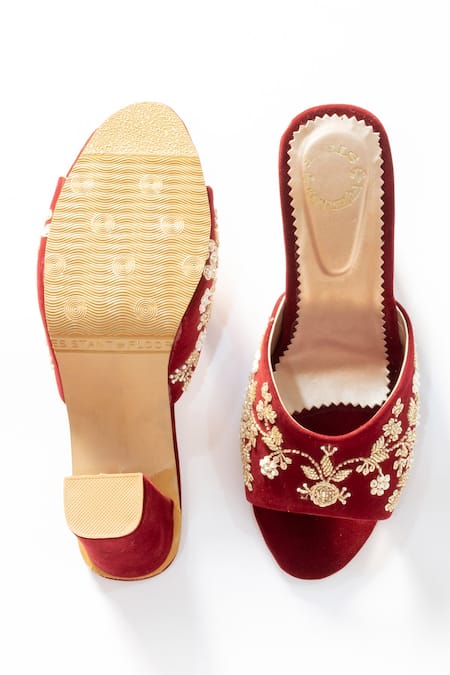 Maroon block heels featuring floral embroidery in cutdana and bead work