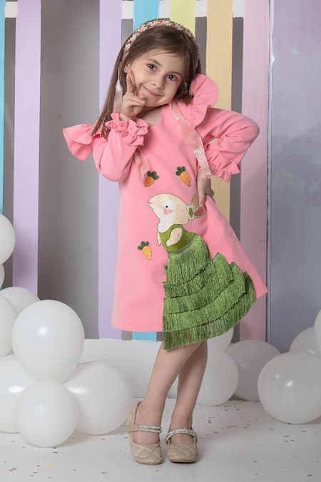 Thread embroidered Bugs Bunny motif, Layered ruffles on sleeves, Colorful carrot embellishments