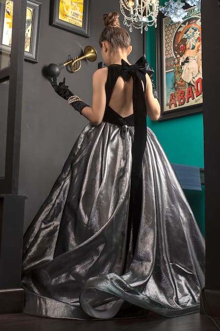 Silver shimmer organza gown featuring a black velvet bodice and back bow tie-up