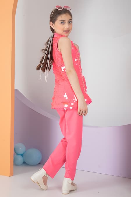 Hot pink crepe blazer featuring big sequins embellishments and a lapel collar. Paired with matching pink pants for a complete look.