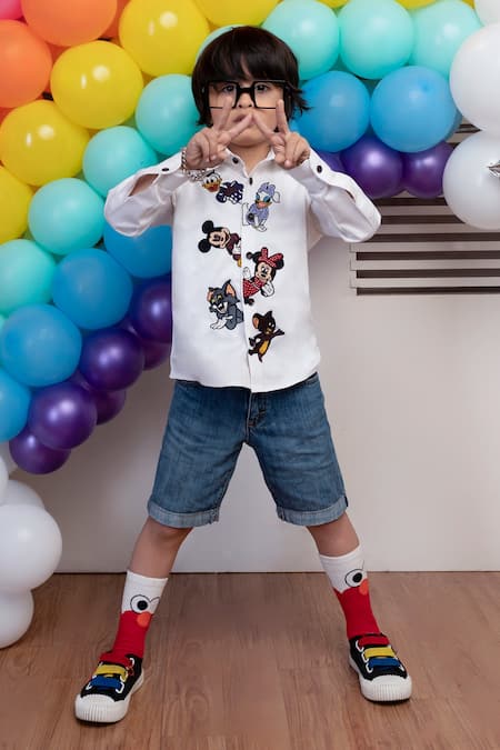 White cotton shirt featuring cartoon embroidered motifs and a front button placket