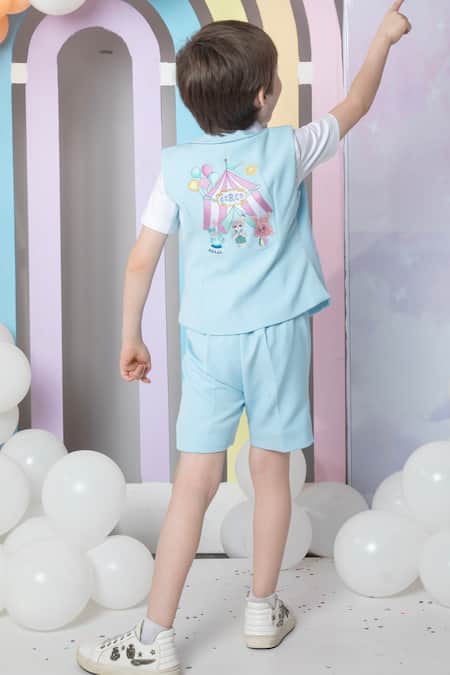 Light blue waistcoat featuring carnival themed embroidery. Paired with coordinating light blue shorts and an inner collared shirt.