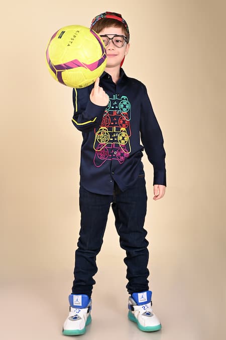 Navy blue shirt featuring full sleeves and a collar with gaming controller embroidery