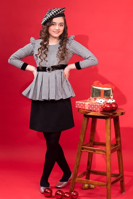 Pleated bodice detail, Attached black skirt with belt, Houndstooth pattern fabric
