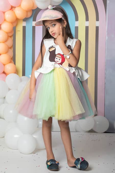 Multi Color Satin, Tulle Embroidery Masha And Bear Flare Dress