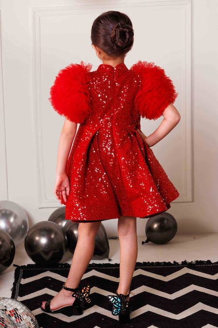 Red sequin full flare dress featuring statement tulle sleeves