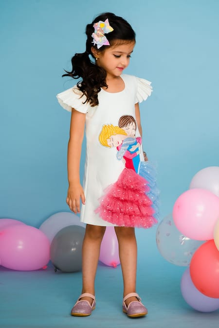 White dress featuring Elsa & Anna embroidered motifs with frill detailing