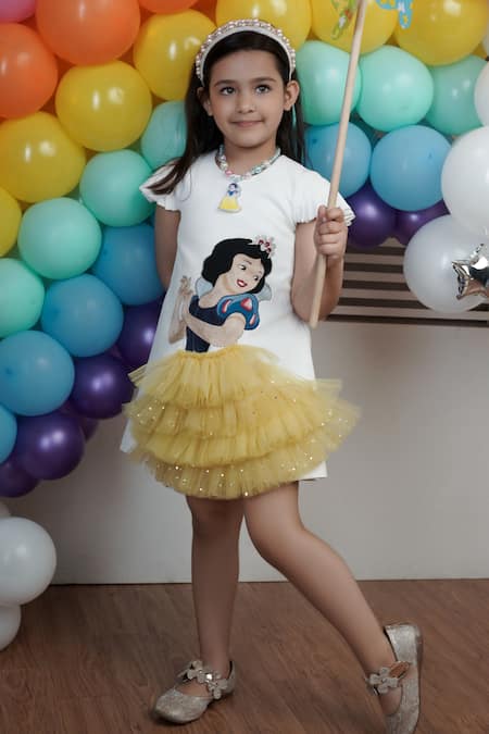 White dress featuring a Snow White embroidered motif and tulle frill detailing