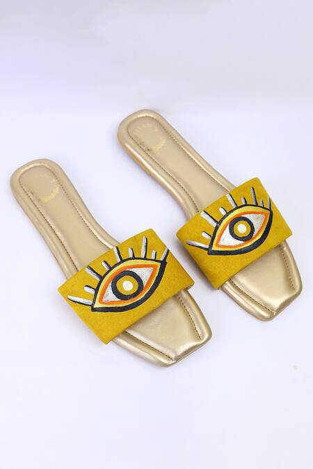 Yellow flats with hand painted top strap featuring eye motif.