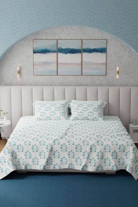 White cotton super king-size bedsheet with aqua blue leaf print. Comes with two pillow covers.
