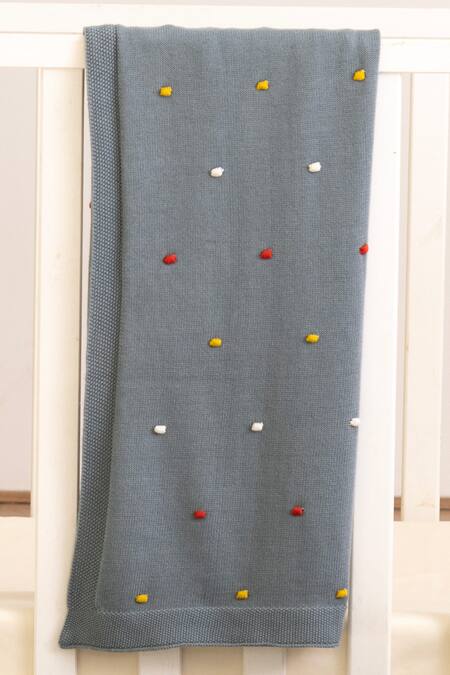 Grey knitted cotton baby blanket crafted in rectangle shape & all over multi color polka dot textured pattern. Paired with toy in striped whale design.