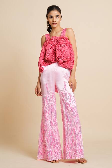 Pink and peach satin jumpsuit featuring hand embroidery.