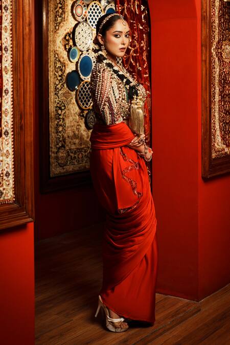 Red pre-draped saree featuring an embellished pallu hem. Paired with a beige padded blouse adorned with stone and pearl hand embroidery.