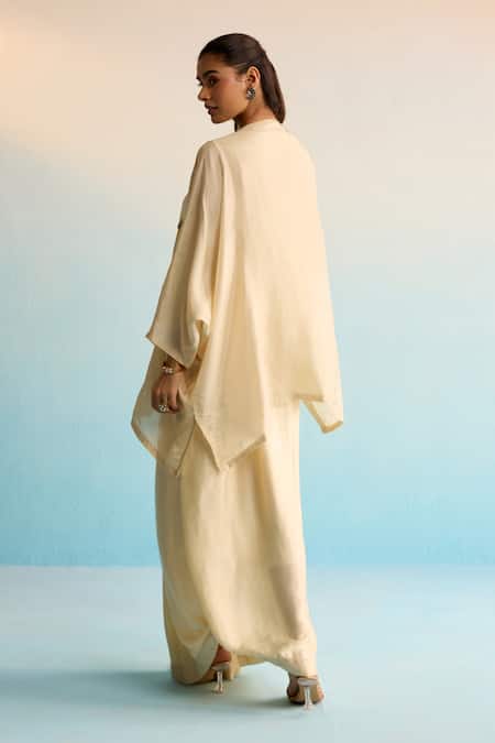 Beige kurta featuring mirror work and pearl embellishments. Paired with a matching skirt for a complete look.