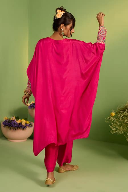 Hot pink kaftan featuring intricate threadwork, cut dana, and pearl embellishments. Paired with a matching palazzo for a cohesive look.