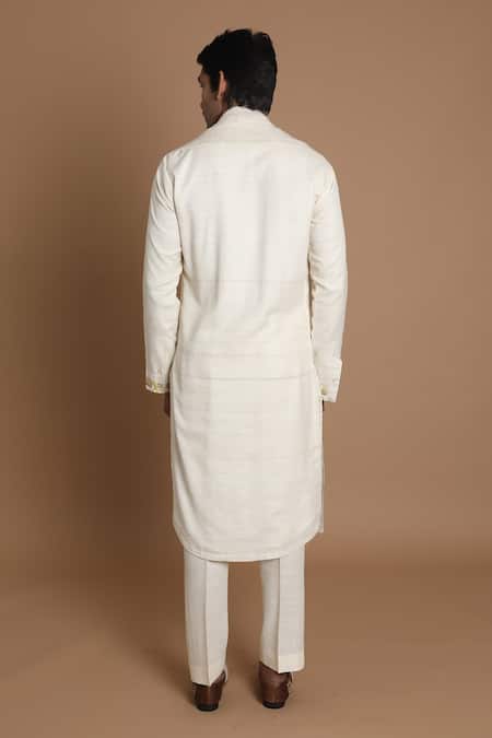 Ivory handloom silk kurta with placement floral embroidery, patch pocket & draped detail.