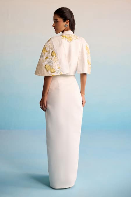 Ivory skirt set featuring a cropped jacket with handpaint, sequins, and cutdana work. Includes a padded blouse and a flowing skirt made from neoprene fabric.