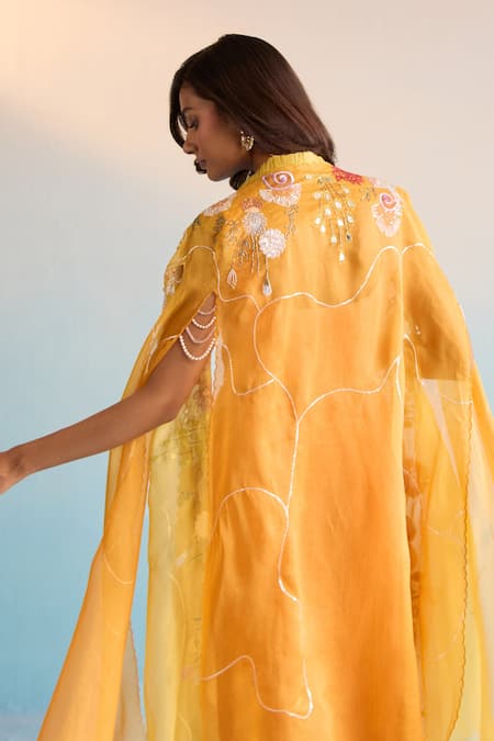Mustard cape featuring organza fabric with handpaint, sequins, and cutdana work. Paired with a matching bustier and skirt made from tissue fabric.