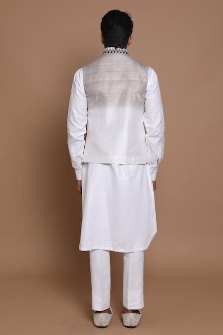 Ombre grey to ivory raw silk overlap bandhgala with geometric embroidery & welt pockets. Paired linen ivory kurta.