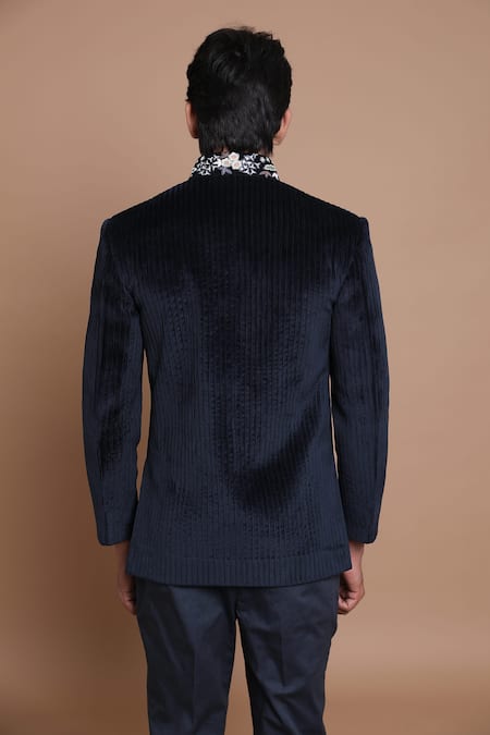 Blue Bandhgala-suede Velvet Embroidered Floral Suede Set