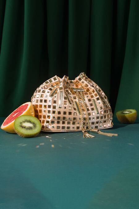 Gold bucket bag featuring all over crystal embellishments. Comes with a metal chain link detachable handle and detachable sling chain.
