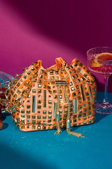 Orange Embellished Crystal Studded Bucket Bag