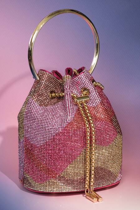 Pink potli bag featuring crystal embellishments in a geometric pattern