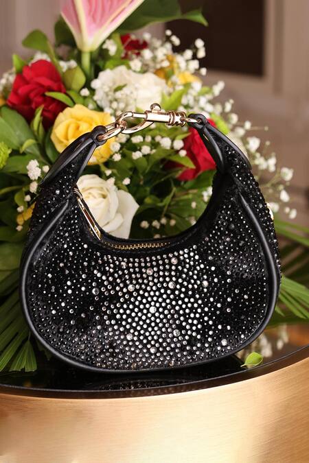 Black velvet bag featuring crystal embellishments and a sling chain. Designed as a stylish accessory for women.