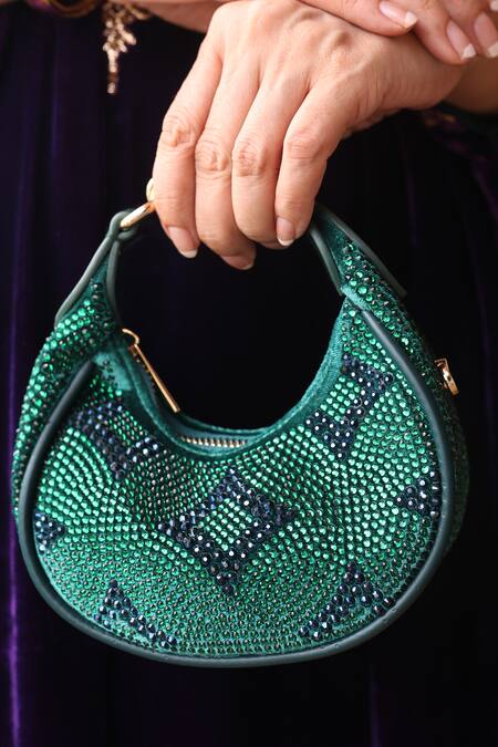 Green velvet fabric bag featuring intricate crystal embellishments. Includes a sling chain for versatile carrying options.