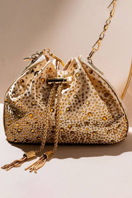 Swarovski crystal and stone embellishments, Pull-out drawstring detail, Small wrist and long sling chain