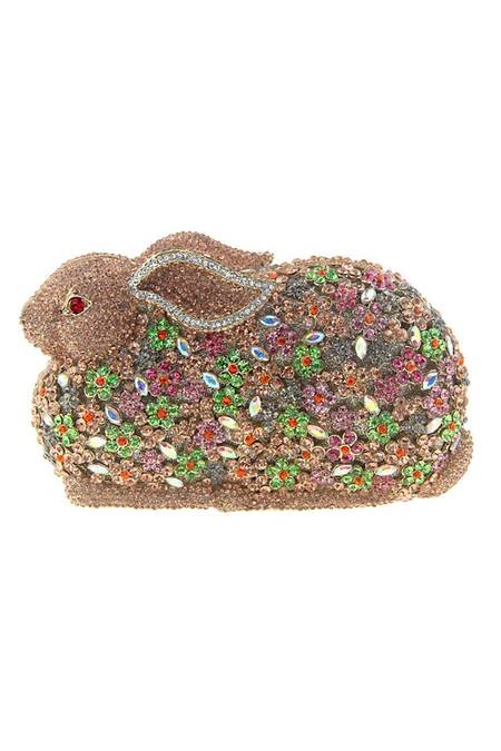 Multicolor rabbit shaped clutch featuring crystals studded in various colors and sizes