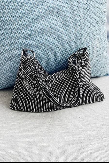 Black handbag featuring rhinestone embellishments and a knotted shoulder strap