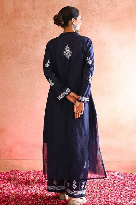 Blue Chanderi Hand Embroidered Chikankari Thread Aabis Kurta Set