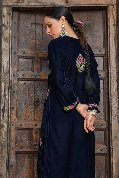 Navy blue velvet kurta featuring chikankari and thread hand embroidery in a floral pattern. Paired with matching pants that have embroidery on the hem.