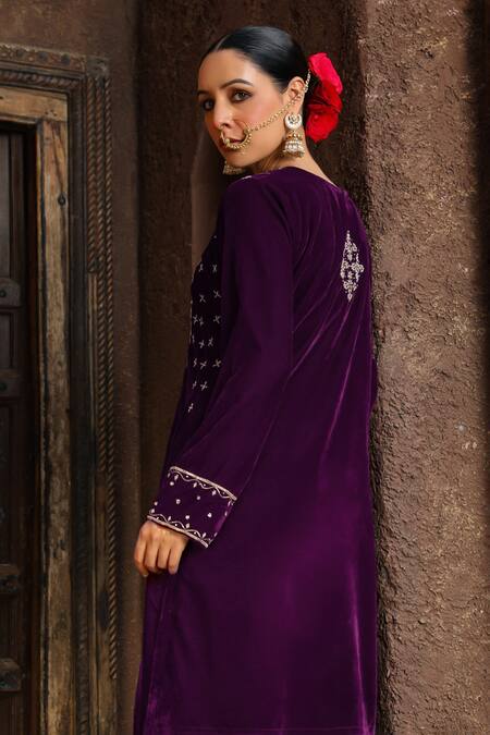 Purple velvet kurta featuring chikankari and thread hand embroidery in a geometric pattern. Paired with matching pants that have embroidery on the hem.