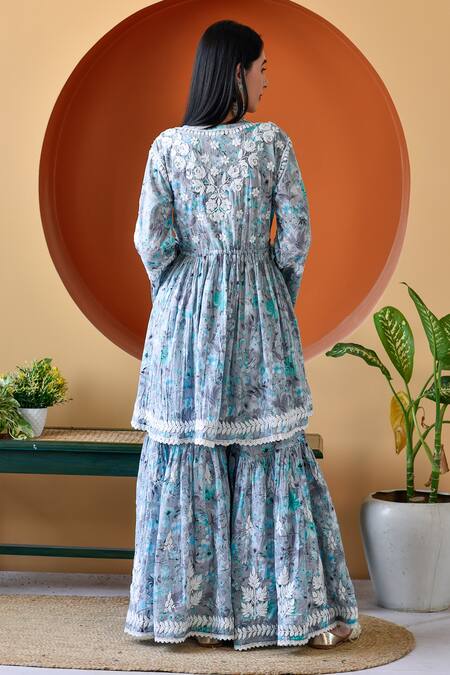 Grey & blue mulmul short anarkali featuring floral print and chikankari thread work. Paired with a printed gharara showcasing embroidered borders and crochet lace cut work hem details.