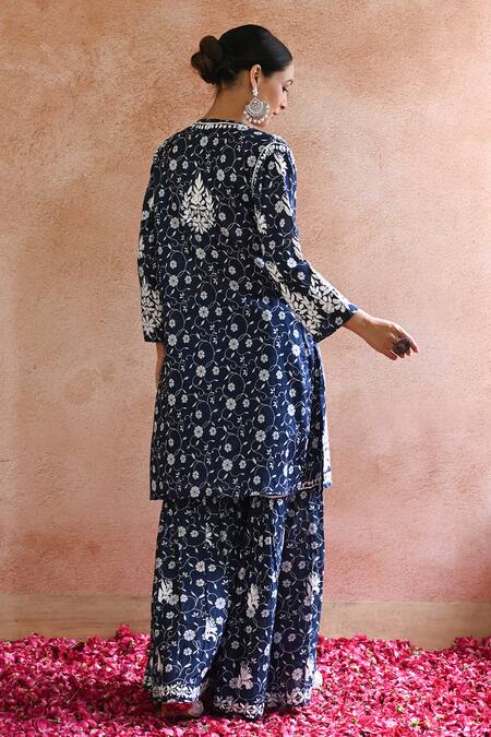 Navy blue kurta featuring floral vine print and chikankari thread hand embroidery. Paired with a matching gharara with embroidered borders.