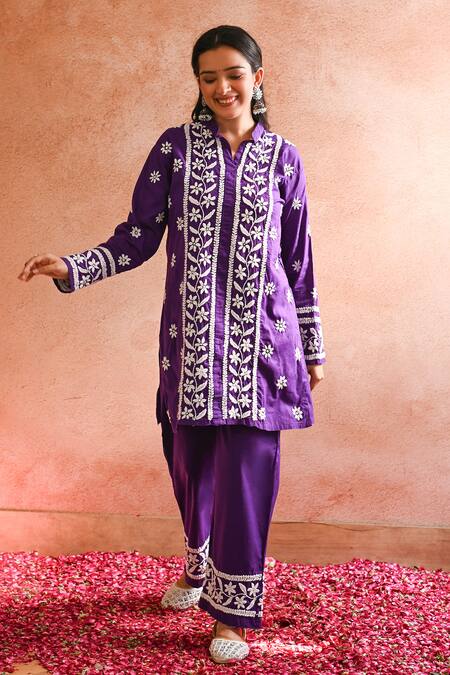 Purple kurta featuring full sleeves, band collar, and intricate chikankari thread hand embroidery. Paired with straight pants adorned with embroidered borders.