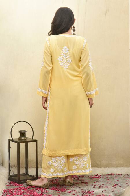 Yellow kurta featuring chikankari hand embroidery in a floral pattern with a notched neckline and full sleeves. Paired with embroidered flared pant.
