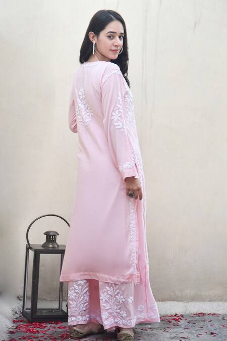 Pink Modal Embroidery Chikankari Notched Neck Malak Kurta With Pant