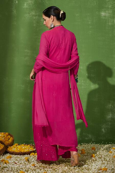 Pink georgette straight kurta featuring floral chikankari work with full sleeves and a U neckline. Paired with an elastic pant and a coordinating dupatta, along with a separate inner.