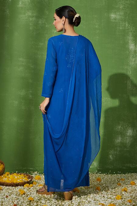 Blue Georgette Embroidery Chikankari Shumaya Floral Kurta Pant Set