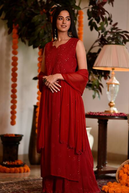 Red Georgette Hand Embroidered Chikankari Sultana Kurta Sharara Set