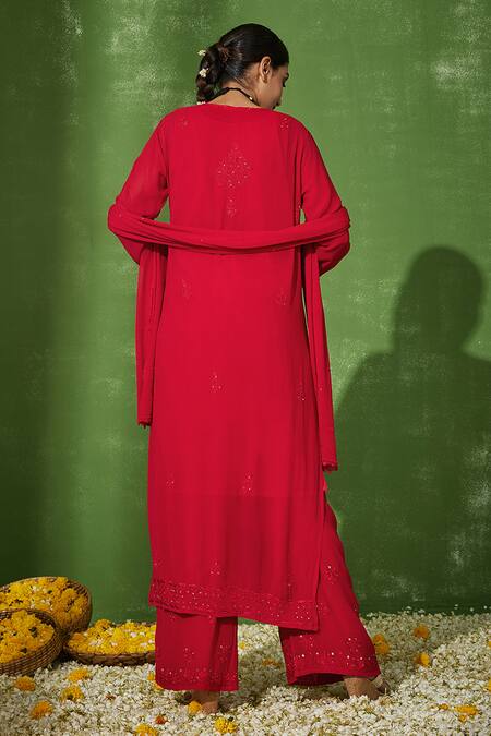 Red georgette straight kurta featuring floral chikankari work and full sleeves. Paired with matching pant and dupatta, comes with a separate inner.