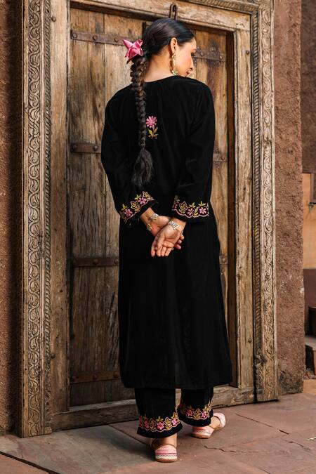 Black velvet kurta featuring chikankari and thread hand embroidery in floral patterns. Paired with matching pant adorned with embroidery on the hem.