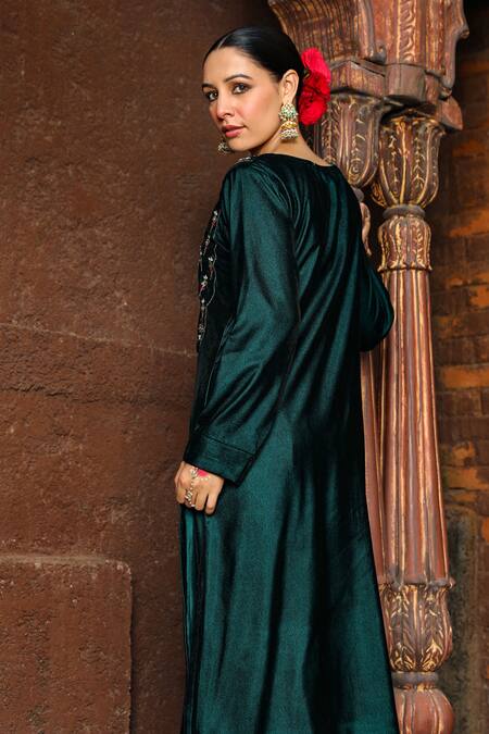 Green velvet kurta featuring chikankari and thread hand embroidery in a floral pattern. Paired with matching pant embellished with embroidery on the hem.