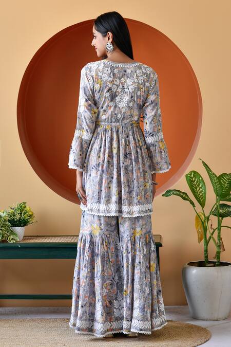 Grey floral print anarkali featuring chikankari thread hand embroidery and bell sleeves. Paired with a printed gharara that has an embroidered border and crochet lace cut work hem details.