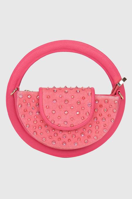 Pink sling bag featuring glass beaded embellishments and a round shape