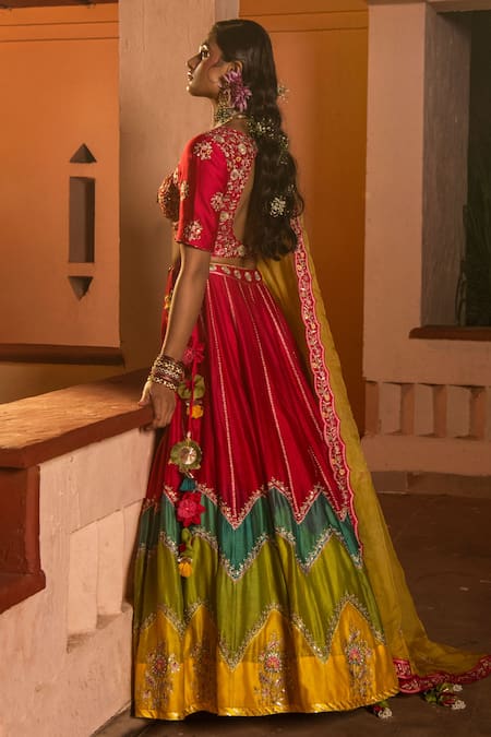Rani pink lehenga in color blocking chevron pattern with multi color resham & zari aari embroidery. Comes with embroidered blouse & yellow organza dupatta.